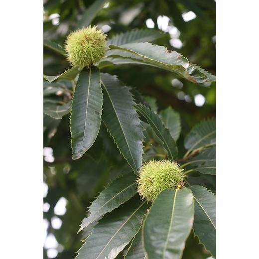 De Tamme kastanje - Castanea sativa is een boom die zijn blad verliest. Tamme kastanje - Castanea sativa word zo'n 25 meter hoog. De bladeren van de Tamme kastanje - Castanea sativa zijn langwerpig en getand. De bloei van de Tamme kastanje - Castanea sativa is in juni-juli, na de bloei verschijnen de eetbare kastanjes aan de boom .